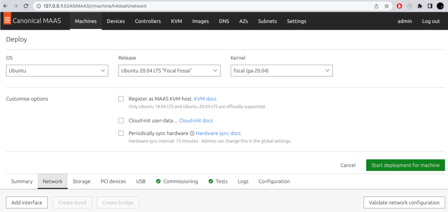 您可以通过选中 **注册为 MAAS 管理的 KVM 主机** 来部署一个新的 KVM 服务器，用于 MAAS 管理的裸机实例。详细信息请参阅 [**添加 KVM 主机**](https://github.com/CanonicalLtd/maas-docs/blob/master/en/manage-kvm-add-host.md)。
