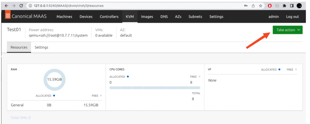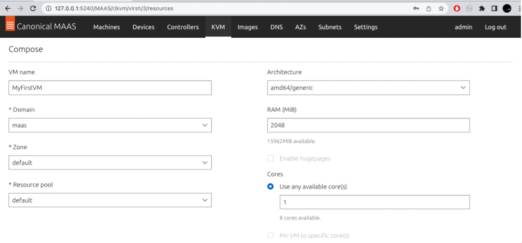 在这种情况下，10.7.7.11 和 12 服务器都已添加到 MAAS 中，您可以点击其中一台服务器并从 **采取行动** 下拉菜单中选择 **组合** 来生成您的第一台虚拟机：