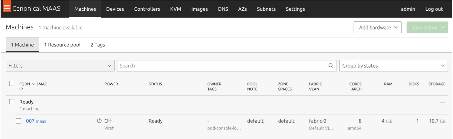 该输出与在虚拟化服务器上运行 `virsh list --all` 的结果完全相同，这意味着 MAAS 与虚拟化服务器（本例中为 KVM）之间的通信工作良好。\\