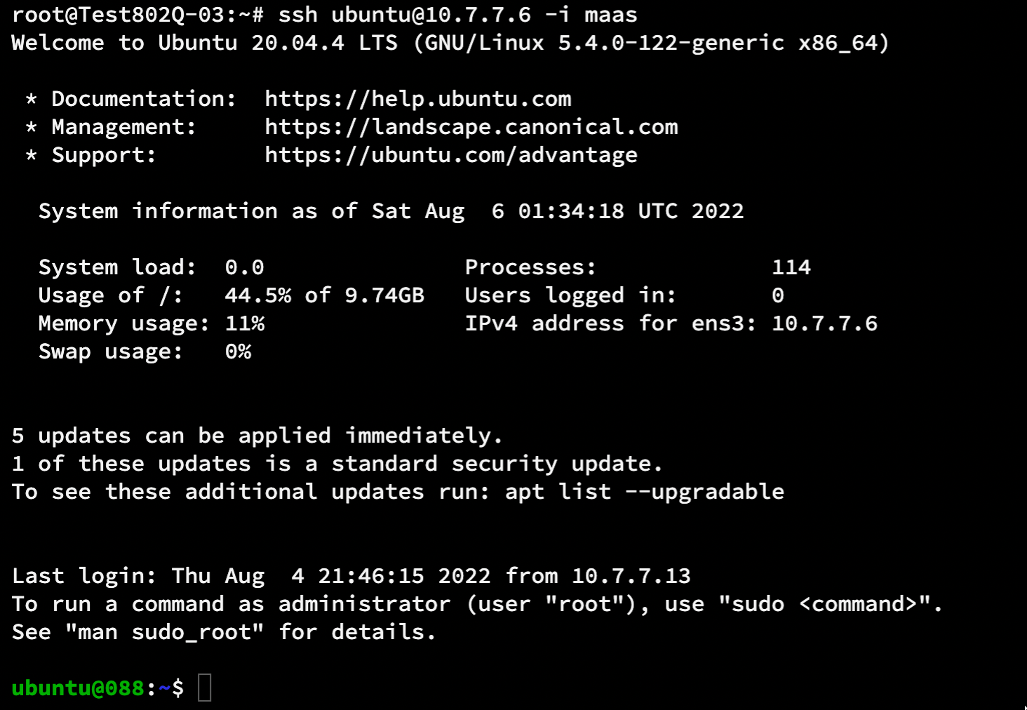 * <mark style="color:blue;">在此示例中，选择 Ubuntu 进行部署，默认用户为 “ubuntu”，而</mark> <mark style="color:blue;">`10.7.7.6`</mark> <mark style="color:blue;">是 VM 088 的 DHCP 分配的内网 IP 地址，该 VM 运行在名为“Test802Q-02”的虚拟机管理程序上。使用 MAAS 管理员的私钥对进行 SSH 登录测试：</mark>