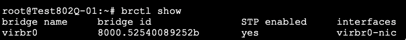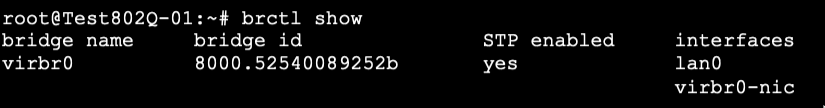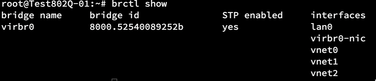 这将从 lan0 移除原始 IP 地址，将其添加到 virbr0。运行 brctl 确认 lan0 已添加到 virbr0：