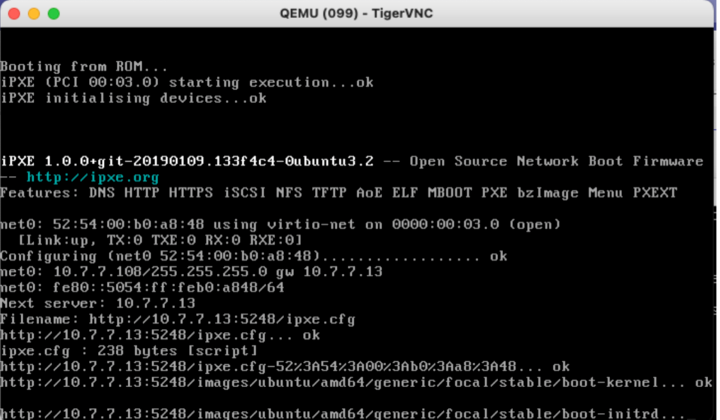 在配置和部署过程中，您还可以启用 VM 的 VNC 访问，屏幕输出将类似于大多数 PXE 引导：