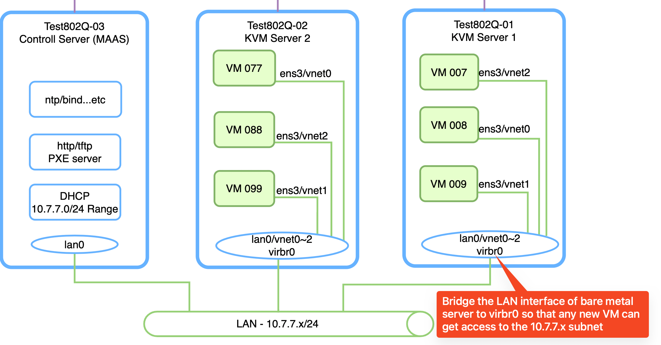 假设用户希望将虚拟机的接口桥接到主机（虚拟机管理程序）的内网 IP 接口，这样虚拟机就可以通过 MAAS 服务器的 DHCP 获得 IP 地址（`10.7.7.x/24` 子网）。还需要更改 KVM 默认网络设置，以确保任何新虚拟机都将使用此桥接：