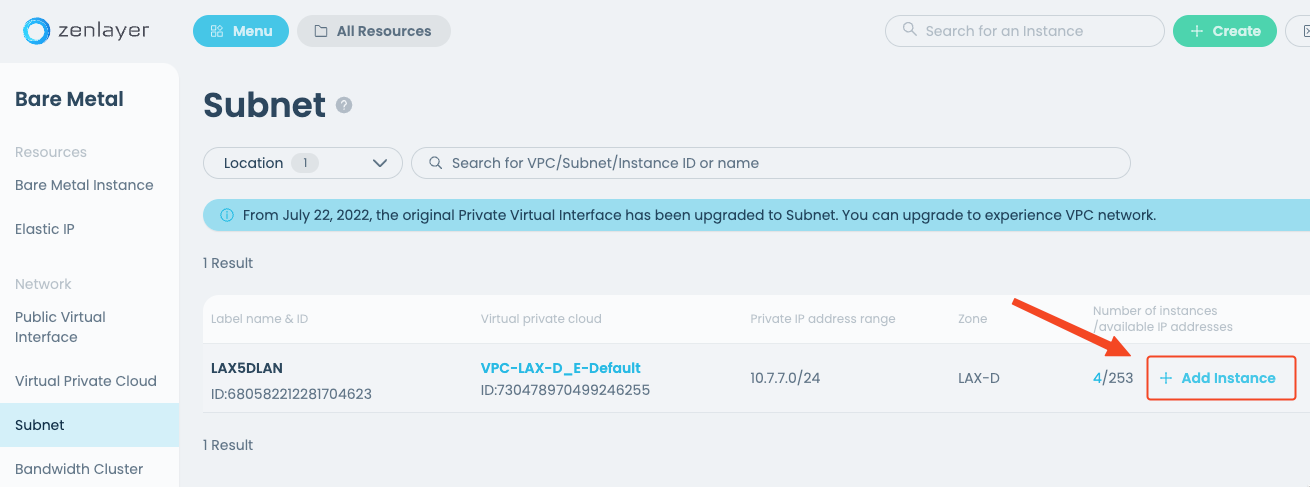 2. 单击 **添加实例** 以将实例附加到您的子网。