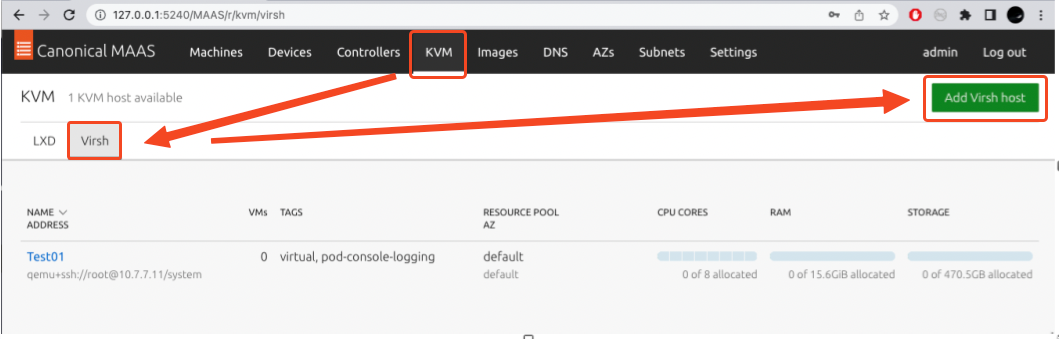在这种情况下，virsh 地址为 `qemu+ssh://root@10.7.7.11/system`。MAAS 将使用 maas 账户登录虚拟化服务器，而不是将其映射到虚拟化服务器上的 root 账户，这是通过将公钥添加到 `/root/.ssh/authorized_keys` 文件中实现的。\