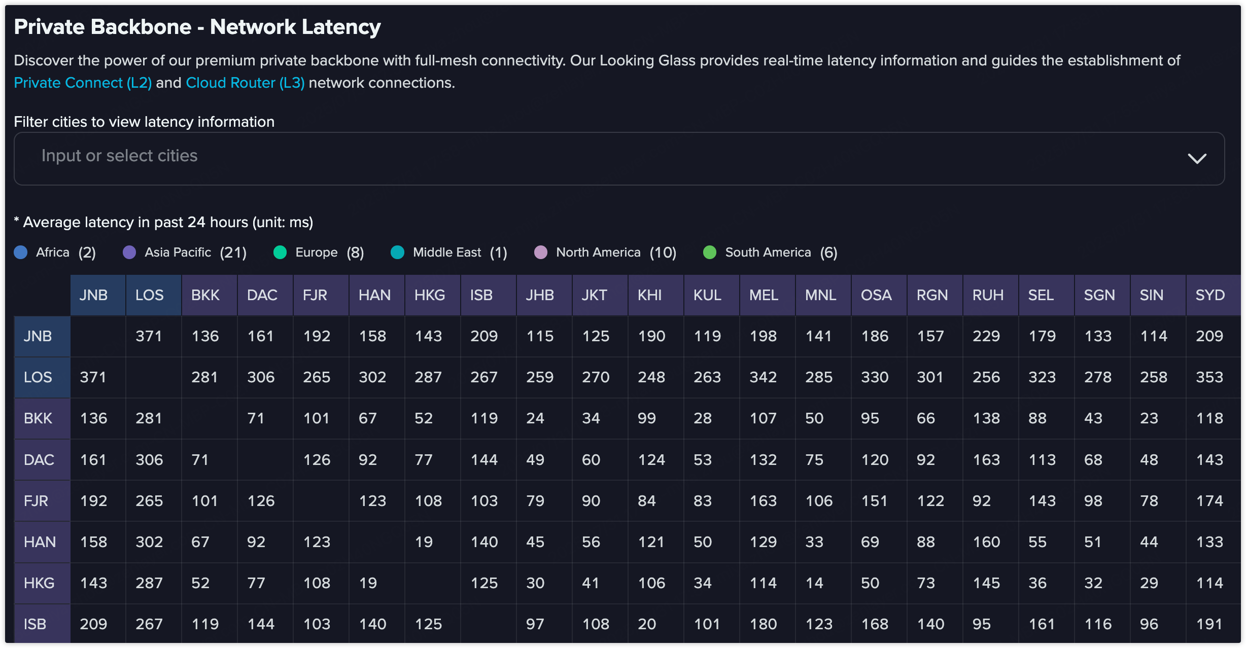 精品专线网络 - 网络延迟（Private Backbone - Network Latency）展示了 Zenlayer 高品质全球专用骨干网络中的实时平均延迟。Zenlayer 的全球 PoP 节点采用全互联（Full-mesh）架构，使用户能够评估核心网络性能，并为 **Private Connect（L2）** 和 **Cloud Router（L3）** 的部署提供规划依据。