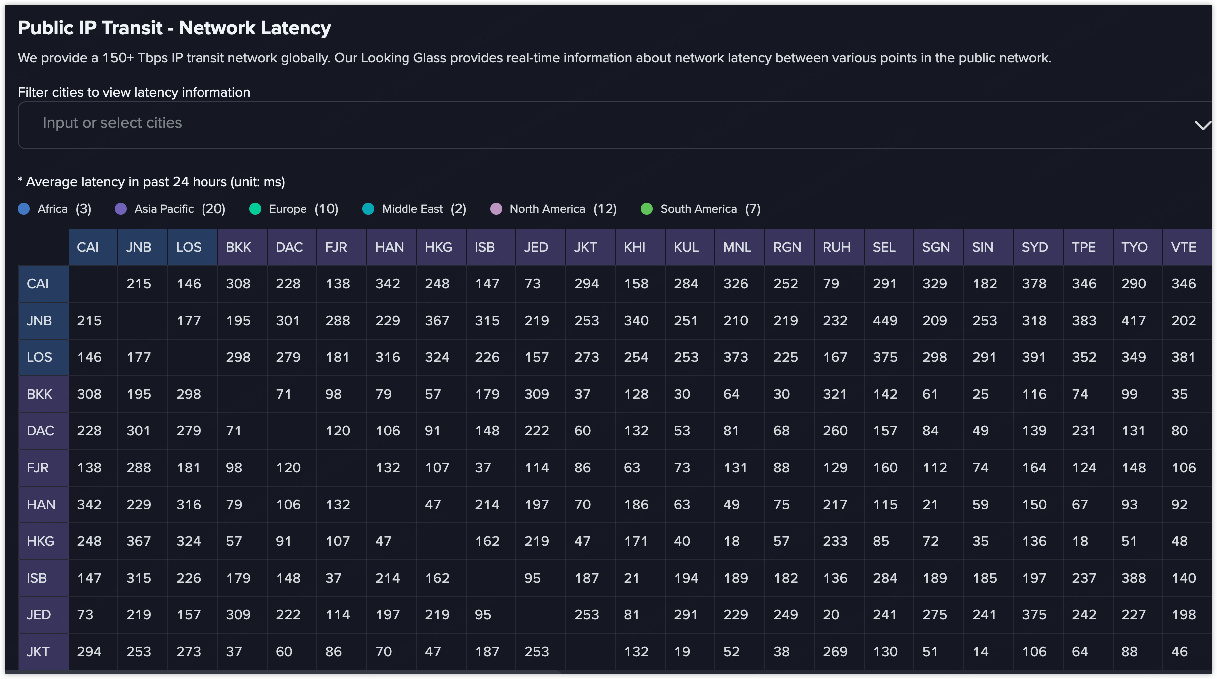 公共 IP Transit - 网络延迟（Public IP Transit - Network Latency）展示了 Zenlayer 全球 PoP 节点之间通过公网传输的实时平均延迟情况。该模块基于 Zenlayer 覆盖全球、容量超过 220+ Tbps 的 IP Transit 网络，帮助用户了解不同区域与运营商之间的公网路由质量。用户可借此监控公网健康状况、对比专线与公网的性能，并优化全球流量调度策略。