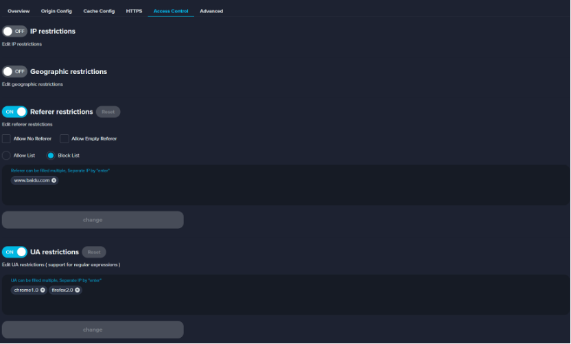 You can enable IP restriction, Geographic restriction, Referer restriction and UA restrictions. These features regulate access to Zenlayer CDN and improve service security.